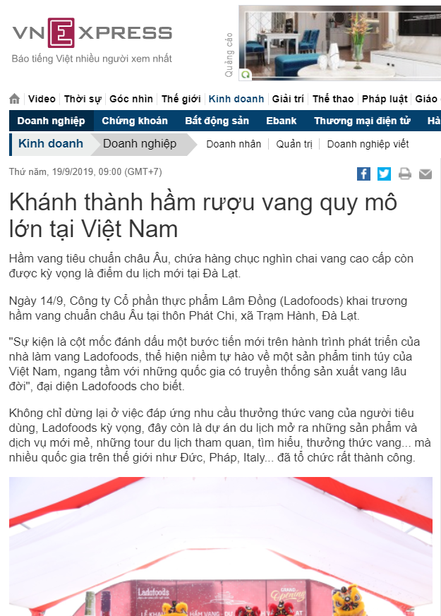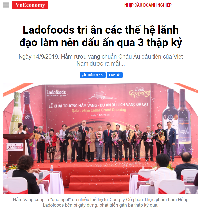 Tháng 9 vừa qua, Công ty TNHH MTV Ladofoods đã khai trương Hầm Vang chuẩn Châu Âu đầu tiên tại Việt Nam. Đây cũng là dấu mốc mới khẳng định vị thế nhà làm vang số 1 Việt Nam cũng như là một bước tiến quan trọng, ghi danh Vang Việt trên bản đồ vang thế giới.